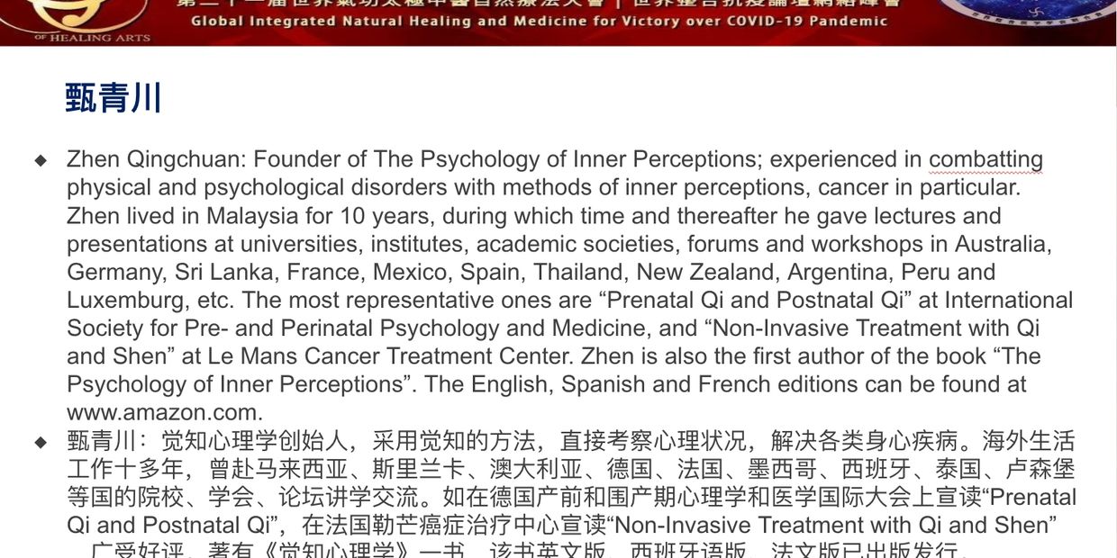 Mr. Zhen Qingchuan is a senior teacher of Zhineng Qigong who he has offered help to over 20000 people round the world to relieve their physical and mental agony. In the course of more than 20 years of practice, Mr. Zhen discovered that many diseases are caused by mental factors, so he founded The Psychology of Inner Perceptions, using the methods of Inner Perceptions to directly sense people's psychological conditions and to solve various physical and mental diseases. His book "The Psychology of Inner Perceptions" currently has Chinese, English, French and Spanish editions.